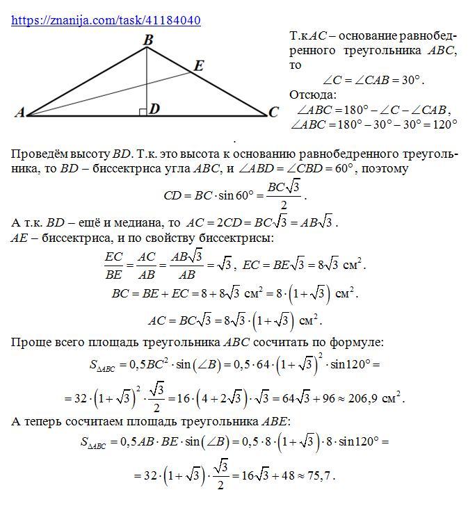 В треугольнике ABC AB=BC, угол CAB=30°, AE - биссектриса, BE=8 см. Найдите площадь треугольника ABC. ответ должен получиться примерно равным 75,7 см^2