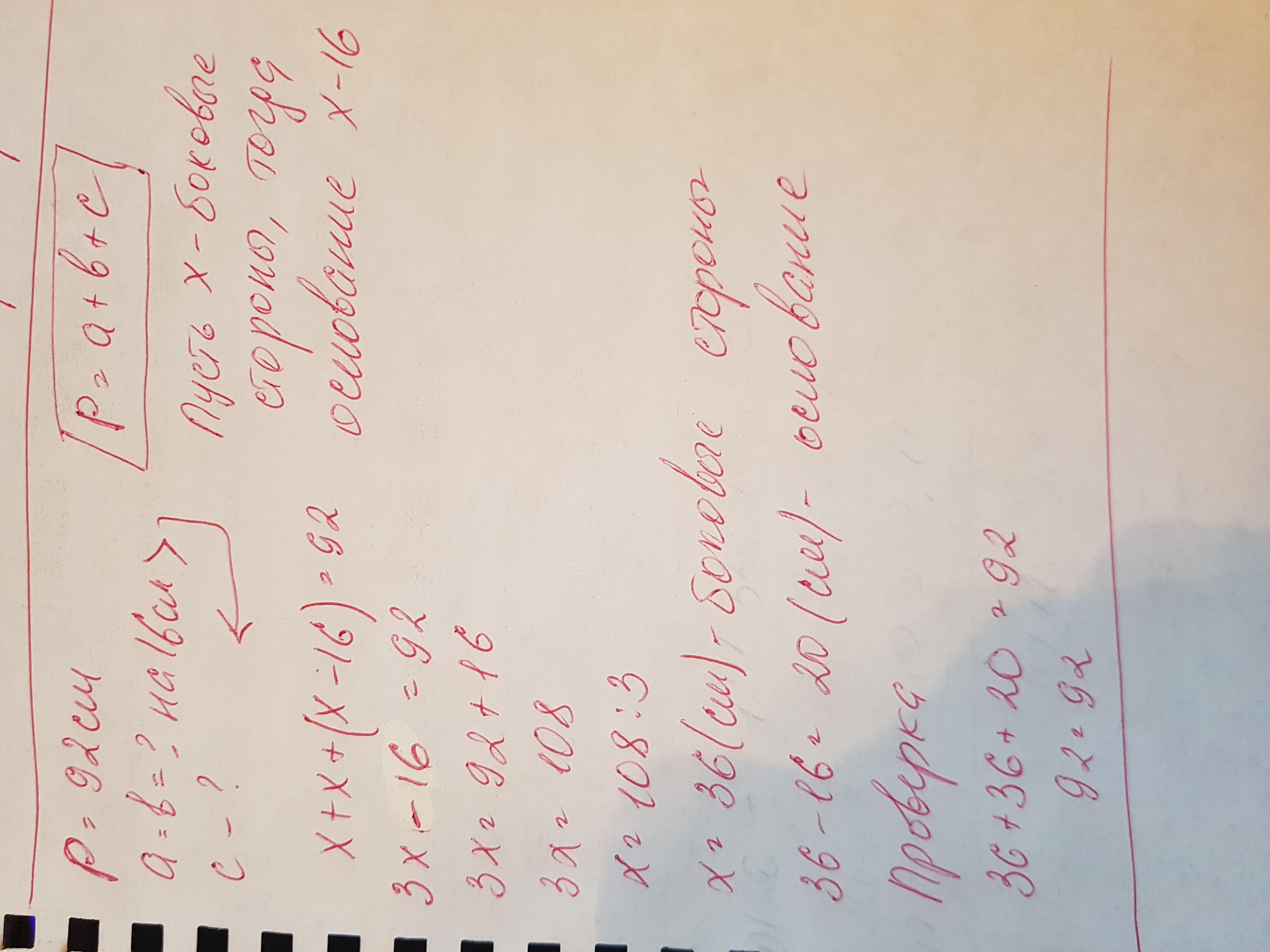Найдите стороны равнобедренного треугольника если его периметр равен 92 см, а боковая сторона на 16 см больше основания.