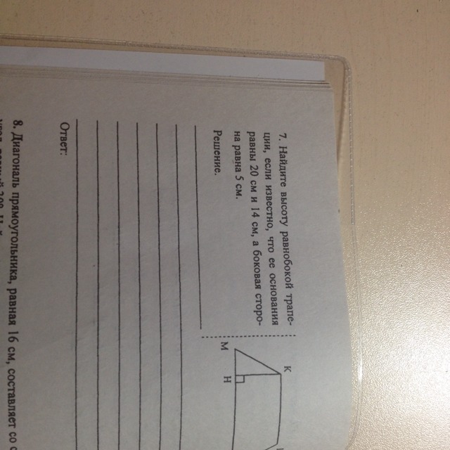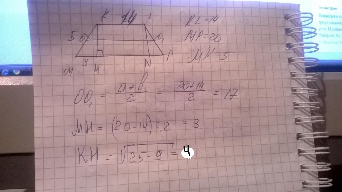 Найдите высоту равнобедренной трапеции,если известно,что ее основания равны 20 см и 14 см,а боковая сторона равна 5 см.