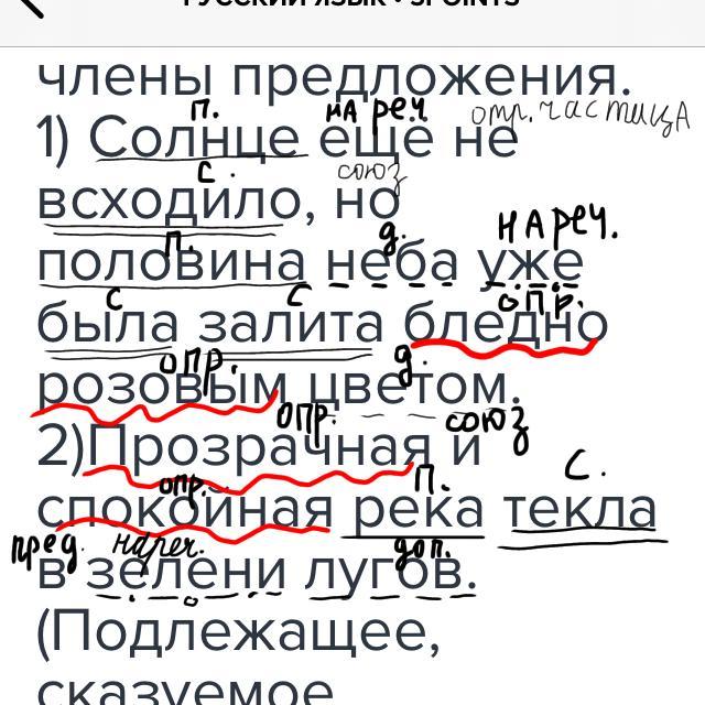 1) Солнце (подлежащее) ещё (наречие) не ( отр. частица ) всходило (сказуемое), но (союз) половина (подлежащее) неба (дополнение) уже (наречие) была (сказуемое) залита (сказуемое) бледно (определение) розовым (определение) цветом (дополнение)