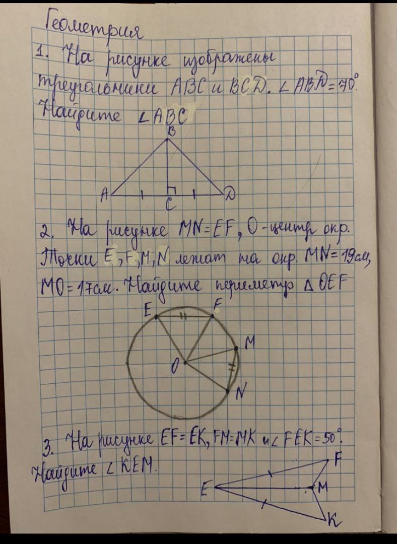Задание 1: так как угол ABD=70 градусов, а BC высота и медиана во одновременно( это признак равнобедренного треугольника) поэтому делим 70:2= 45