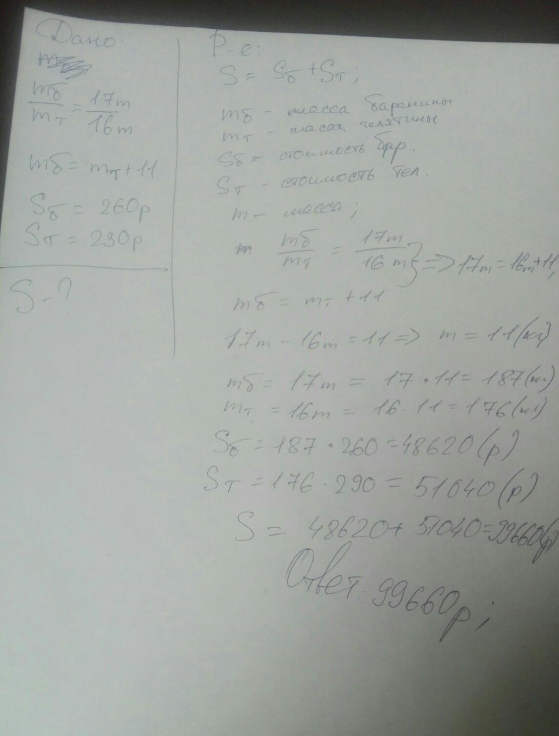 Найди стоимость проданного мяса, если известно, что масса баранины относится к массе телятины как 17:16 и баранину продали по 260 р., а телятину — по 290 р. за 1 кг.