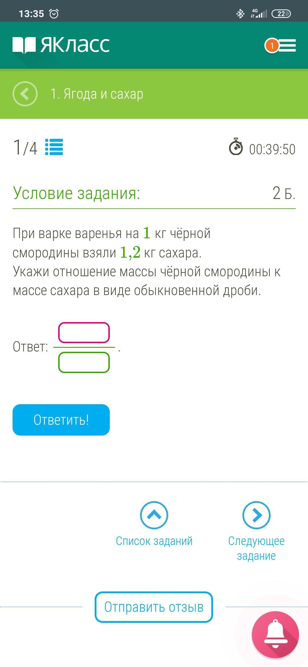 сахара взяли 1,2=12/10 1 кг смородины:12/10 кг сахара= 10:12=5:6