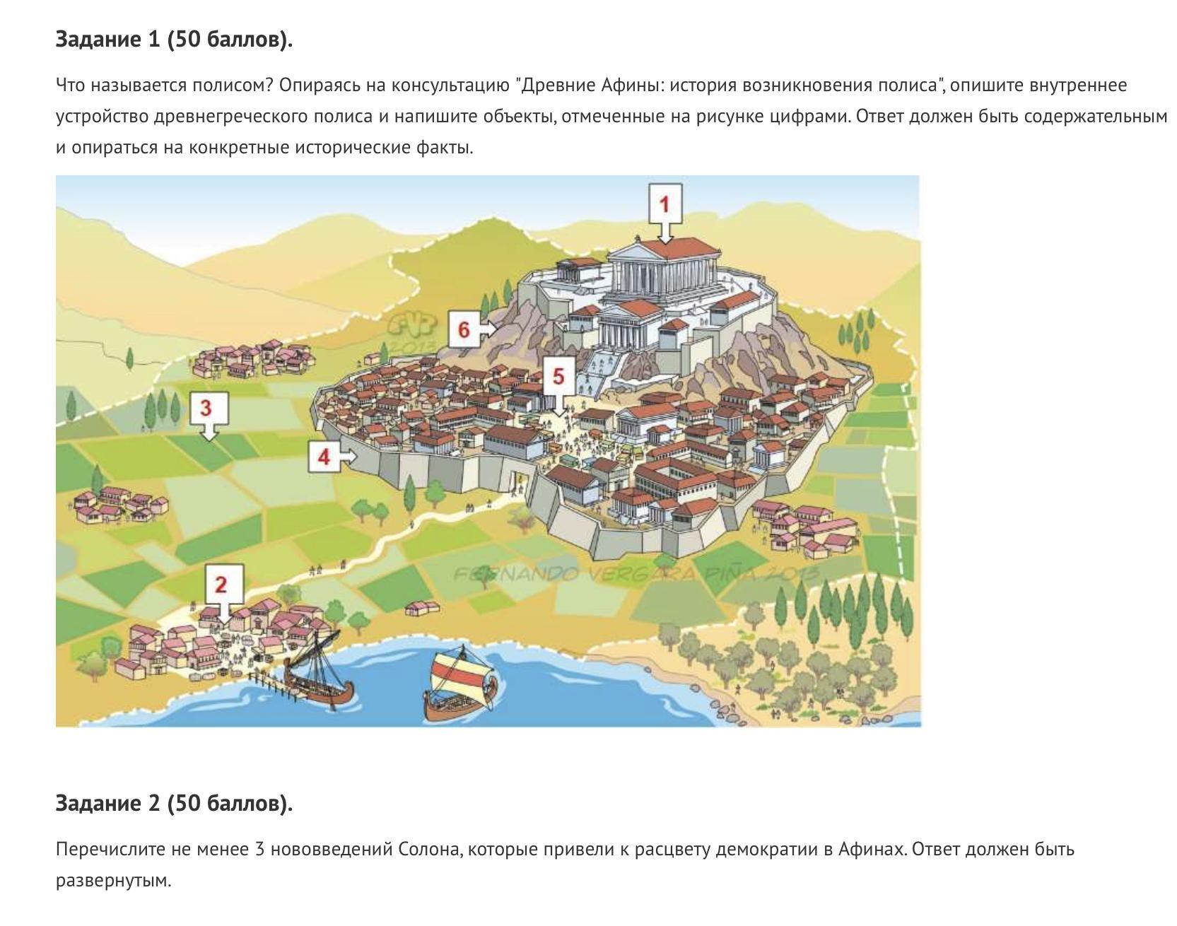 Центром каждого греческого полиса был город, окруженный стенами, а вокруг него проживало и трудилось сельское население. Приморские города строились на высоких холмах, находившихся на небольшом расстоянии от берега. Вокруг акрополя распологались поселения граждан. А у самого подножия акрополя, где находились храмы богов-покровителей, устраивалась рыночная площадь — агора, одновременно являвшаяся и местом народных собраний.