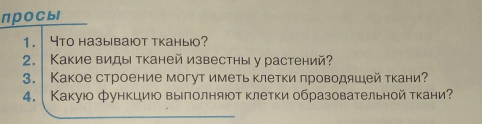 1)Ткань — система клеток и межклеточного вещества, объединённых общим происхождением, строением и выполняемыми функциями. Строение тканей живых организмов изучает наука гистология. Совокупность различных и взаимодействующих тканей образуют органы. 2)Образовательная ткань, покровная, механическая, проводящая и запасающая.