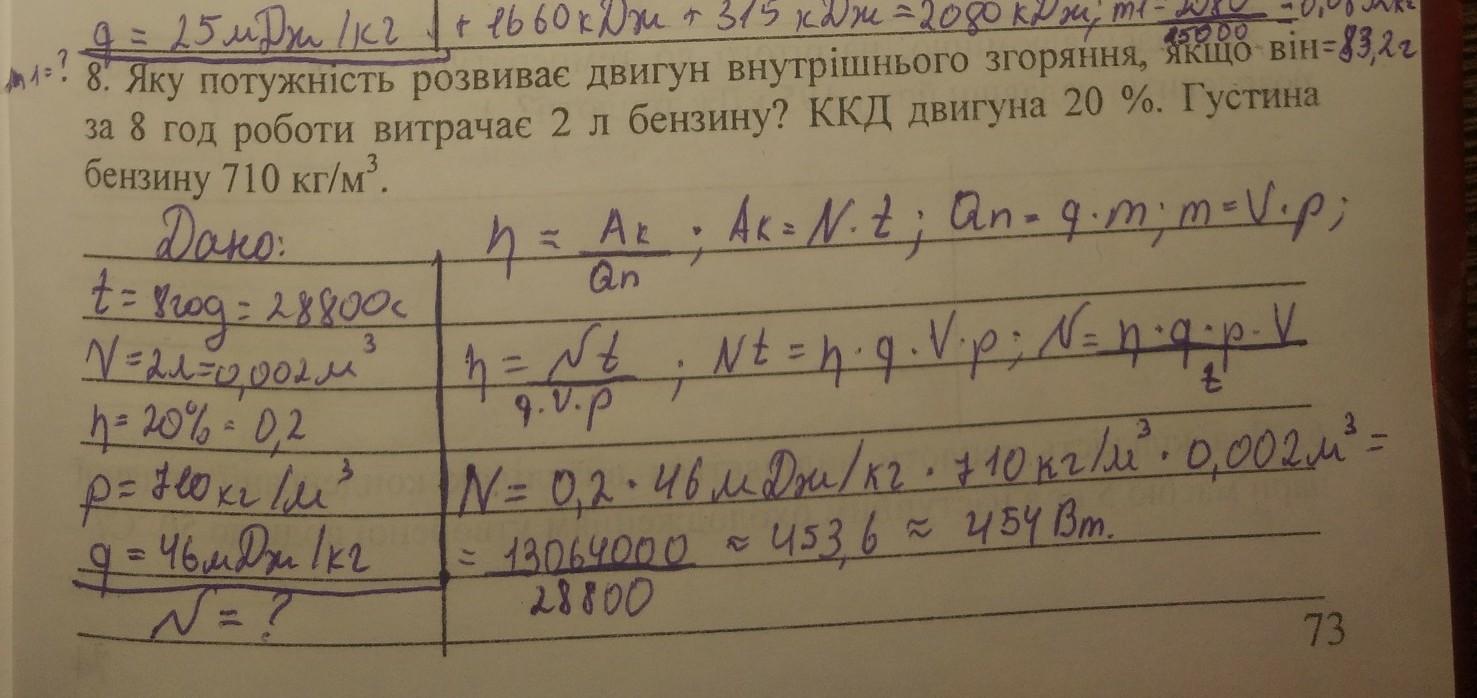 яку потужність розвиває двигун внутрішнього згоряння, якщо він витрачає за 8 год роботи 2 л бензину? ккд 20