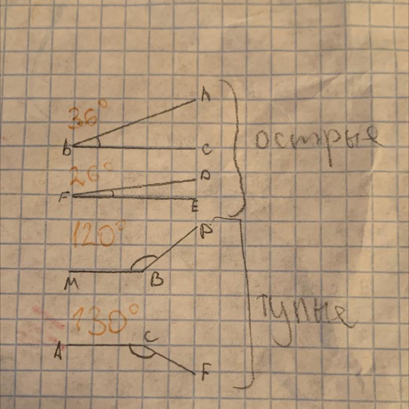 Начертите два острых и два тупых угла . Обозначьте их .Измерьте их транспортиром и запишите результаты