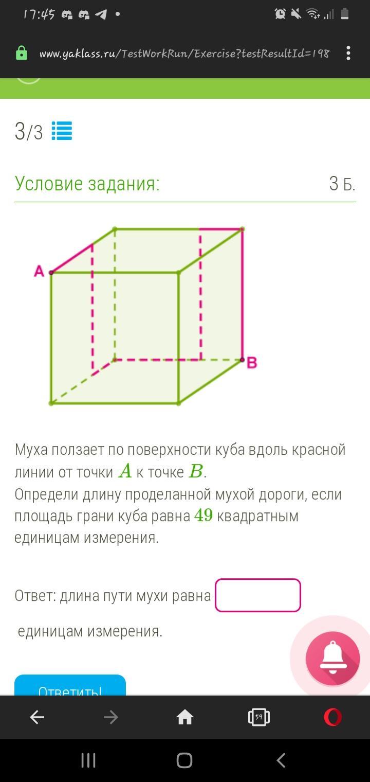 Определи длину проделанной мухой дороги, если площадь грани куба равна 49 квадратным единицам измерения. длина пути мухи равна.....