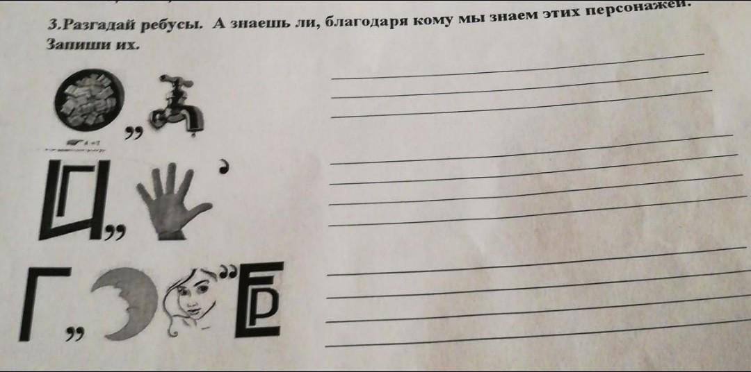 Разгадай ребусы. А знаешь ли, благодаря кому мы знаем этих персонажей. Запиши их. ПОЖАЛУЙСТА СРОЧНО ПРОШУ 4 РАЗ!!! НУ АЛООООО ПОМОГИТЕ СРОЧНО НАДО