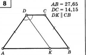 Так как DK параллельно CB и DC параллельно KB, значит DKBC - параллелограмм. Значит, DC=KB=14,15 см. Найдем AK. AK=AB-KB=27,65 см-14,15 см=13,5 см. По свойству биссектрисы угла в трапеции имеем, что DA=AK, значит P=13,5+13,5+27,65+14,15=68,8 см.
