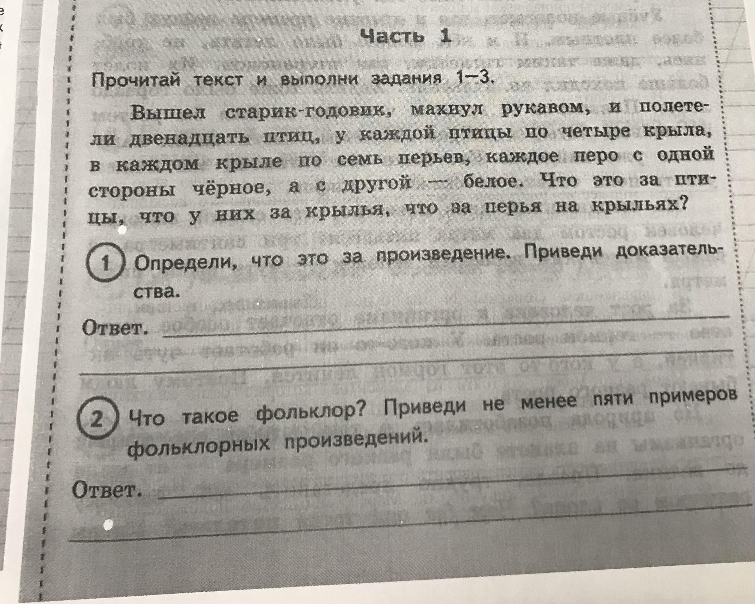 1. Это произведение фольклорное - загадка. Образ фольклора (УНТ) - старик-годовик. Двенадцать птиц - также фольклорный образ двенадцати месяцев . Эти образы свойственны устному народному творчеству, так как год - старый человек - постоянный (типический) образ русского фольклора. Месяц - птица. Месяц проходит - как птица пролетает. Такое сравнение также характерно для фольклора. И структура - метафорическое описание. (Повтори метафору). Об одном предмете говорится с помощью повествования о другом. Это аллегория. Она свойственна загадке. Вот все доказательства.