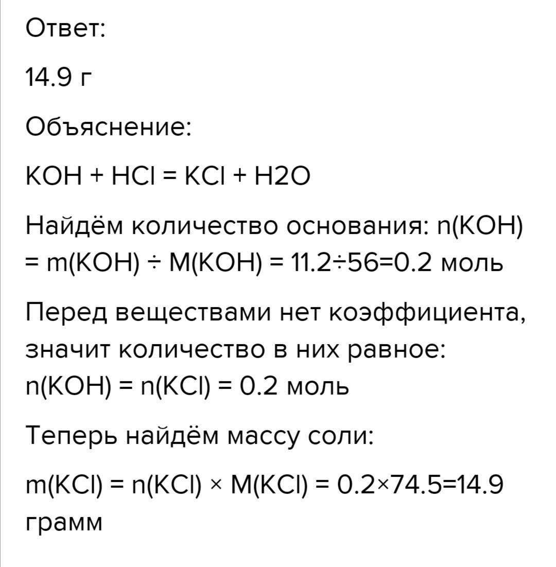 Запишите уравнение реакции нейтрализации в результате которой образуется хлорид калия, Рассчитайте массу соли если известно что в реакцию вступает основание массой 11,2г