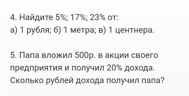 4) 1 р.=100 коп. 100*5:100%=5коп по этой схеме остальное только менять процент 5-17-23