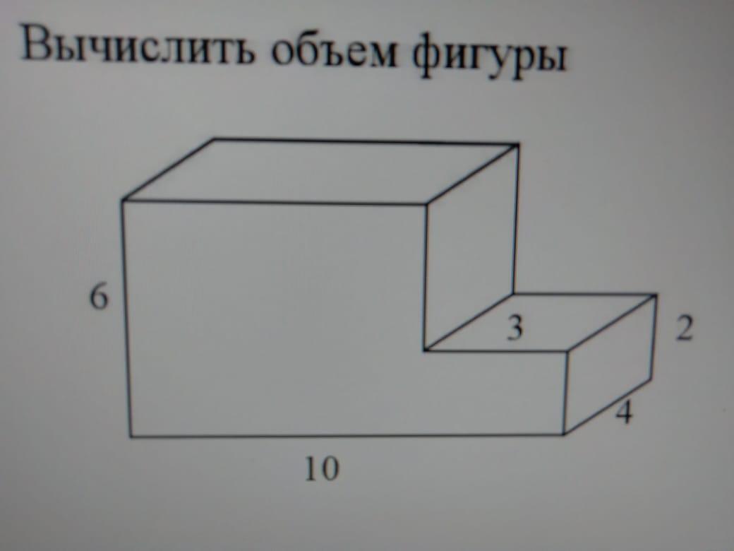 Чтобы решить эту задачу, необходимо иметь пространственное мышление. Мысленно разделим данную фигуру на два параллелепипеда. Объём большего из них будет равен: 6*4*(10-3)=168. Объём меньшего параллелепипеда будет равен: 3*2*4=24. Общий объём будет равен: 168+24=192.