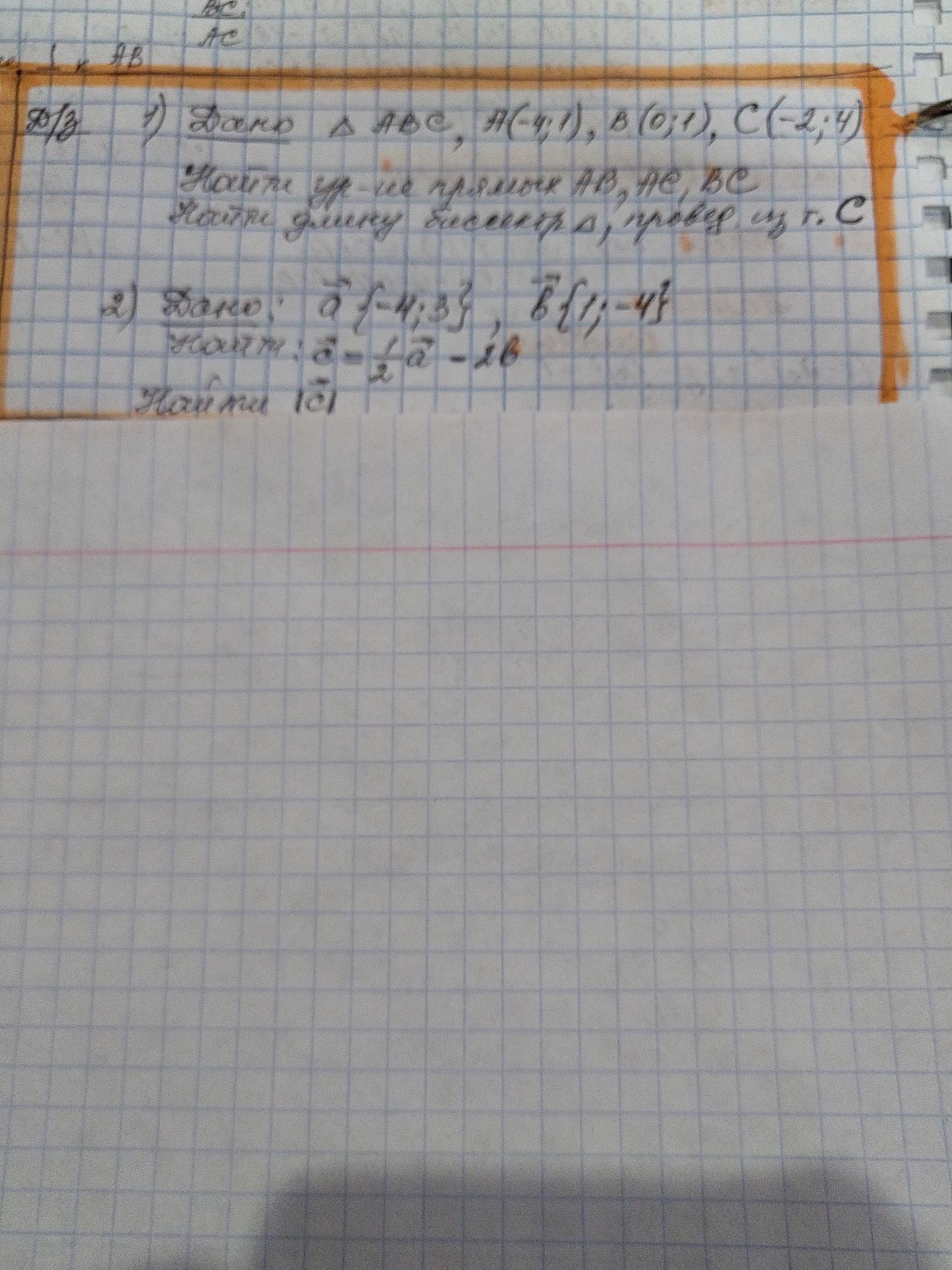 Дано АВС А(-4;1) В(0;1) С(-2;4) Найти: 1) уравнения прямых АВ,ВС,АС