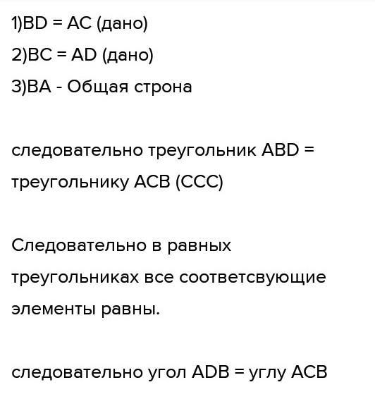 следовательно треугольник ABD = треугольнику ACB (ССС)
