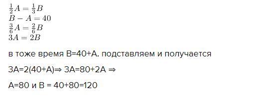 1/2 части числа А равна 1/3 части числа В. Найдите числа А и В, если число А меньше числа В на 40 едениц.
