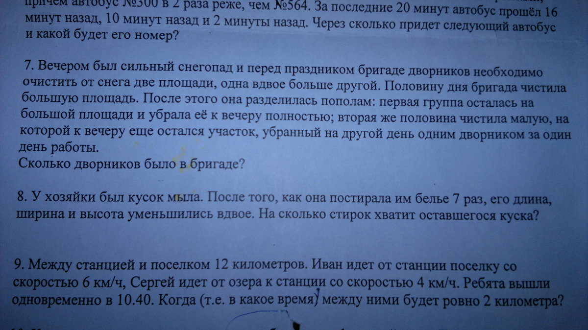 7. Больший участок чистила полдня целая бригада и полдня полбригады, значит полбригады почистили 1/3 большего участка, что является 2/3 от меньшего участка. Значит 1/3 меньшего участка за 1 день почистил 1 человек, следовательно, за полдня треть маленького могло почистить только 2 человека, а расчищено было в два раза больше, значит и человек было в два раза больше, т.е. 4 чел. Таким образом 4 человека - это 1/2 бригады, 8 человек - вся бригада