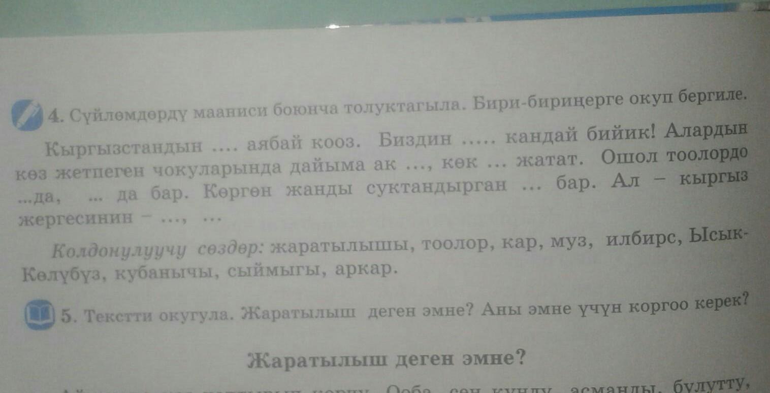 Кыргызстандын жаратылышы аябай кооз. Биздин тоолор кандай бийик! Алардын көз жетпеген чокуларында дайыма ак кар көк муз жатат. Ошол тоолордо илбирс да, аркар да бар. Көргөн жанды суктандырган Ысык-Көлүбүз бар. Ал кыргыз жергесинин сыймыгы, кубанычы.
