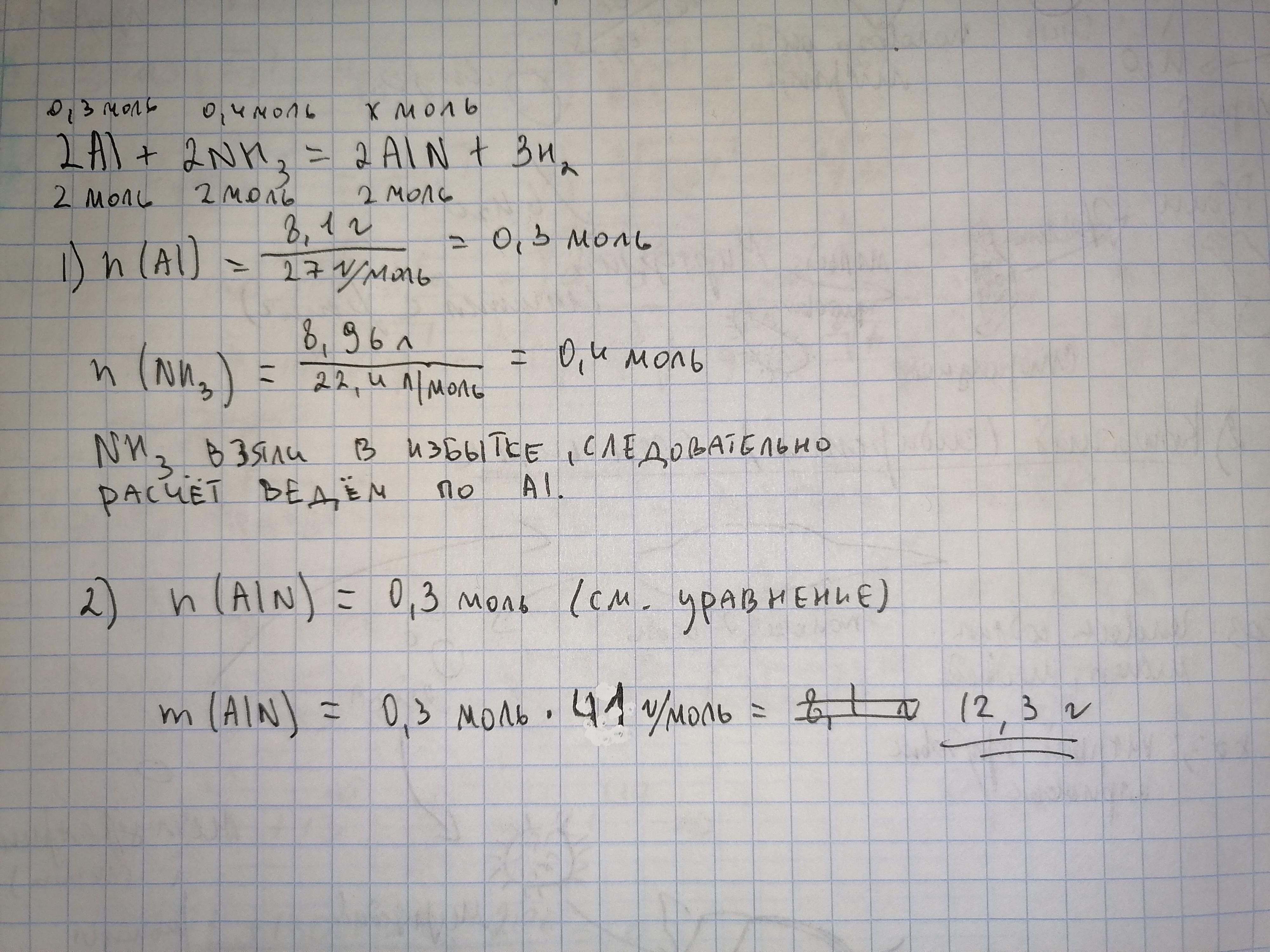 Нитрид алюминия AlN получают взаимодействием порошка алюминия с аммиаком при температуре 1000 градусов по цельсия. Определите массу нитрида, который можно получить из 8,1 г алюминия и 8,6 л аммиака (н.у.)