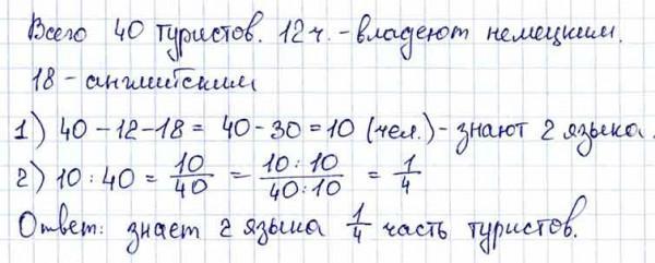 в одном туре оказалось что с 40 туристов знаю немецкий язык только 12 человек английский язык знает 18 человек остальные туристы знают 2 иностранные языка Какая часть туристов знает 2 иностранных языка