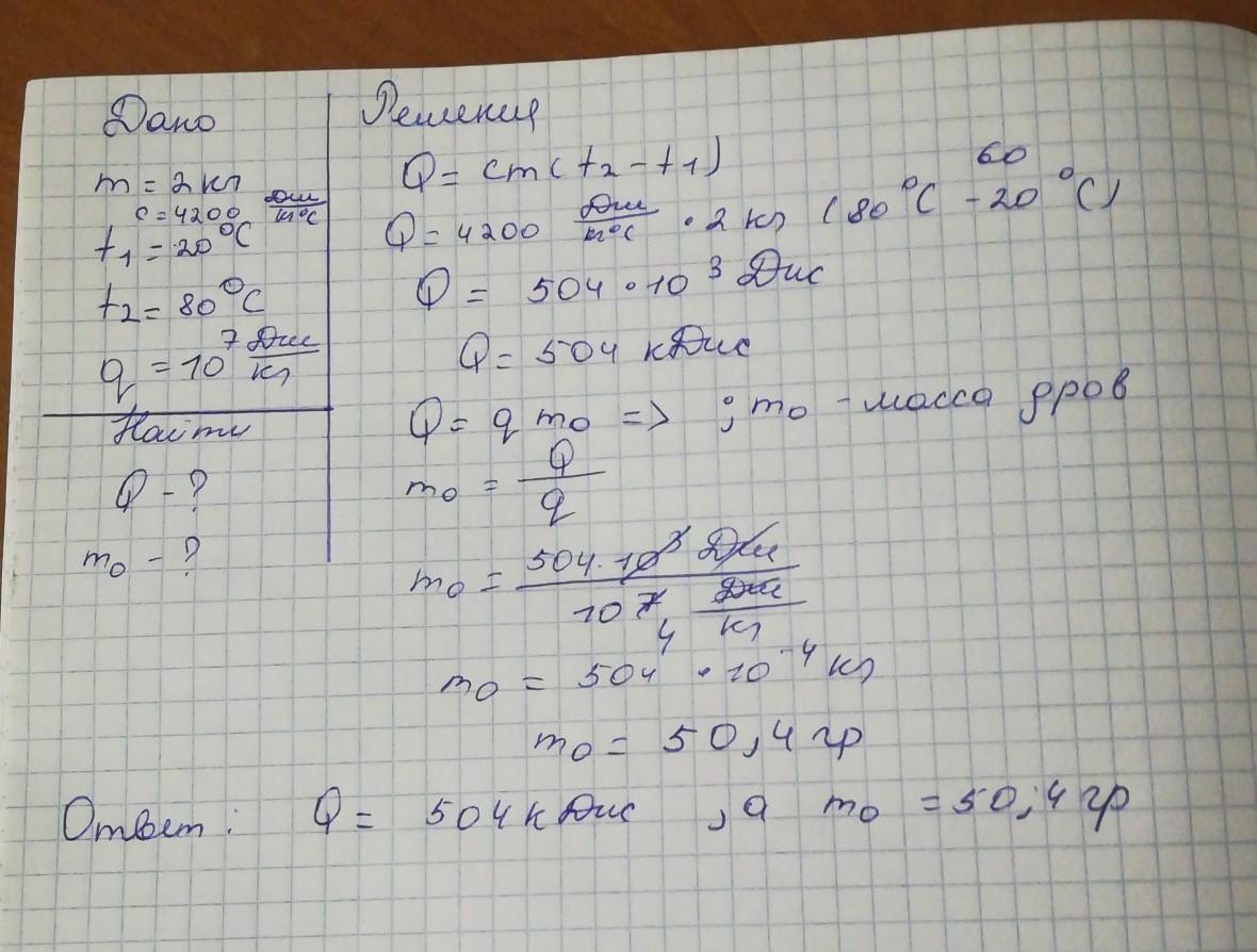 Воду массой 2кг нагревают от 20° до 80° . а) сколько тепла нужно б) сколько кг дров нужно чтобы такое кол-во тепла? (не обращайте внимание на потерю тепла )