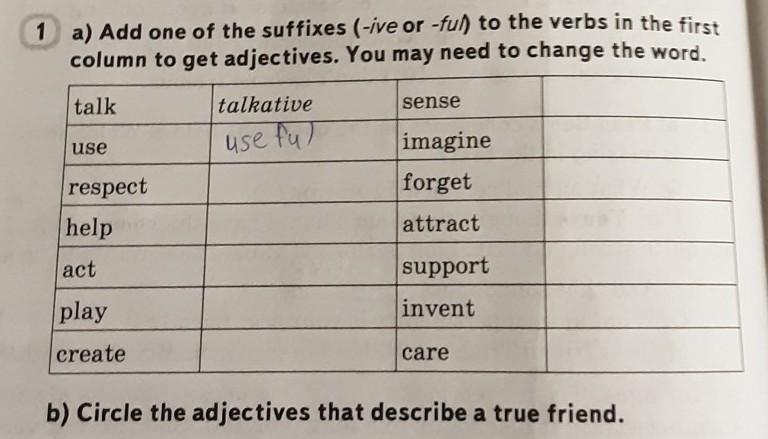 a) Add one of the suffixes (-ive or -ful) to the verbs in the first