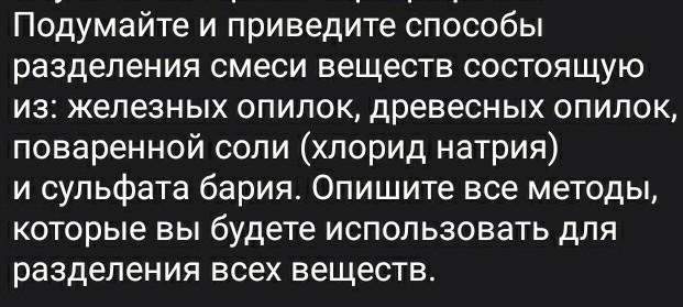 железные и древесные опилки это использование магнита для железа , и фильтрование для древесины.