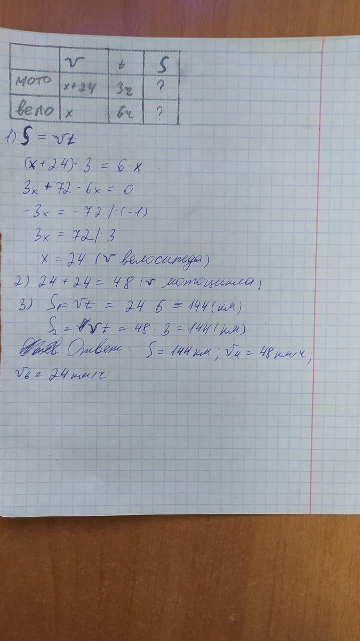 S = 144, v(мотоцикла) = 48км/ч, v(велосипеда) = 24 км/ч
