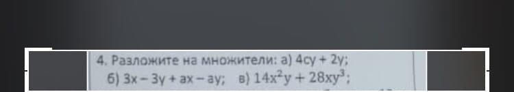a)\;\;4cy+2y=2y(2c+1)\\\\b)\;\;3x-3y+ax-ay=3(x-y)+a(x-y)=(x-y)(3+a)\\\\b)\;\;14x^2y+28xy^3=14xy(x+2y^2)