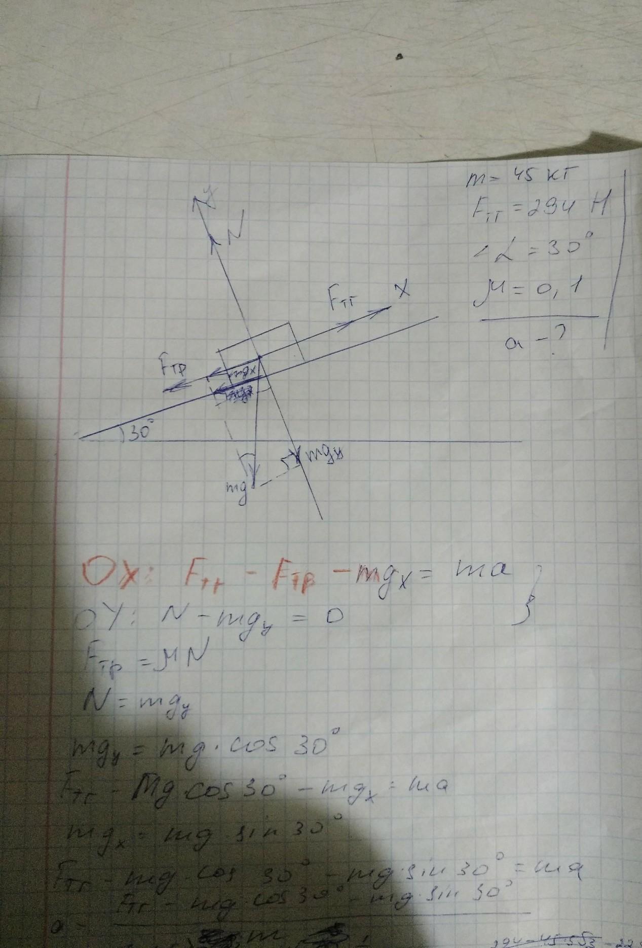 Груз массой 45 кг перемещается по горизонтально плоскости под действием силы 294Н, направленной под углом 30° к горизонту коэффициента трения груза 0,1. Определить ускорение тела. Какой тут рисунок должен быть, помогите пж