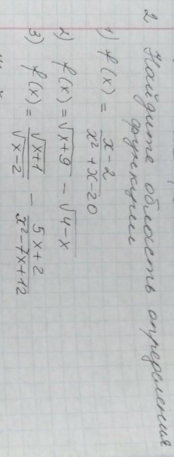 3)f(x)=\frac{\sqrt{x+1} }{\sqrt{x-2}}-\frac{5x+2}{x^{2}-7x+12}\\\\\left \{ {{x+1\geq0;x-2>0 } \atop {x^{2}-7x+12\neq0}} \right.\\\\1)x+1\geq0\Rightarrow x\geq-1\\\\2)x-2>0\Rightarrow x>2\\\\3)x^{2}-7x+12\neq0\Rightarrow x_{1}\neq3;x_{2}\neq 4\\\\Otvet:\boxed{x\in(2;3)\cup(3;4)\cup(4;+\infty)}