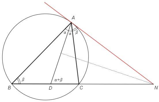 Серединный перпендикуляр биссектрисы AD треугольника ABC пересекает луч ВС в точке N. докажите что прямая NA-касательная к окружности, описанной около треугольника АВС.
