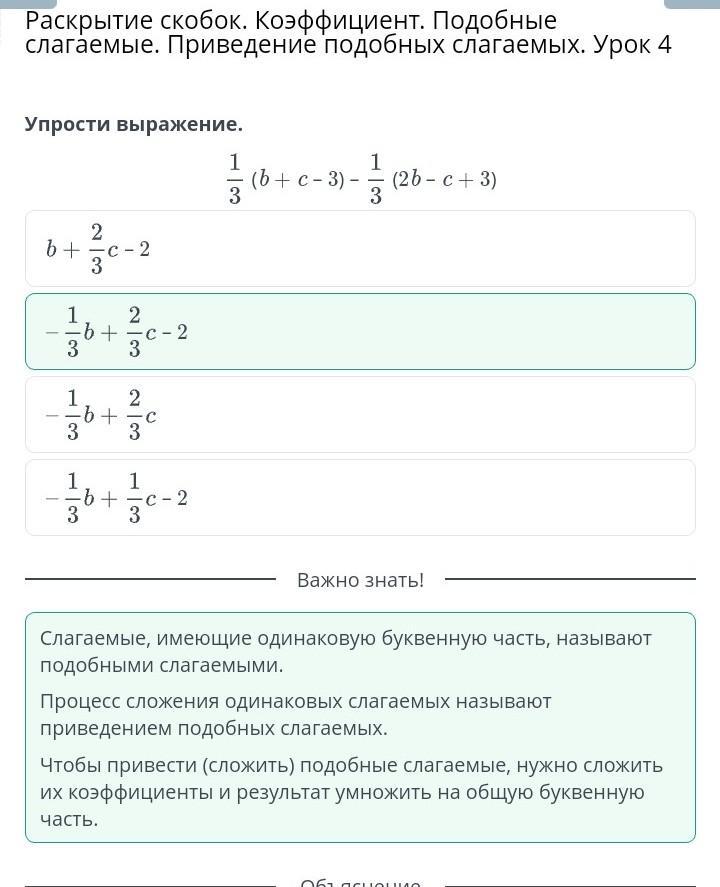 Раскрытие скобок. Коэффициент. Подобные слагаемые. Приведение подобных слагаемых. Урок 4. Упрости выражение. 1/3(b+c-3)-1/3(2b-c+3)