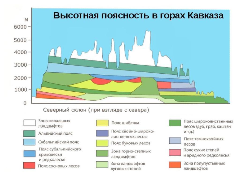 3) Географическое строение, рельеф.Схема высотных поясов Кавказских гор дана ниже в приложении.Кавказские горы относятся к альпийской складчатости.