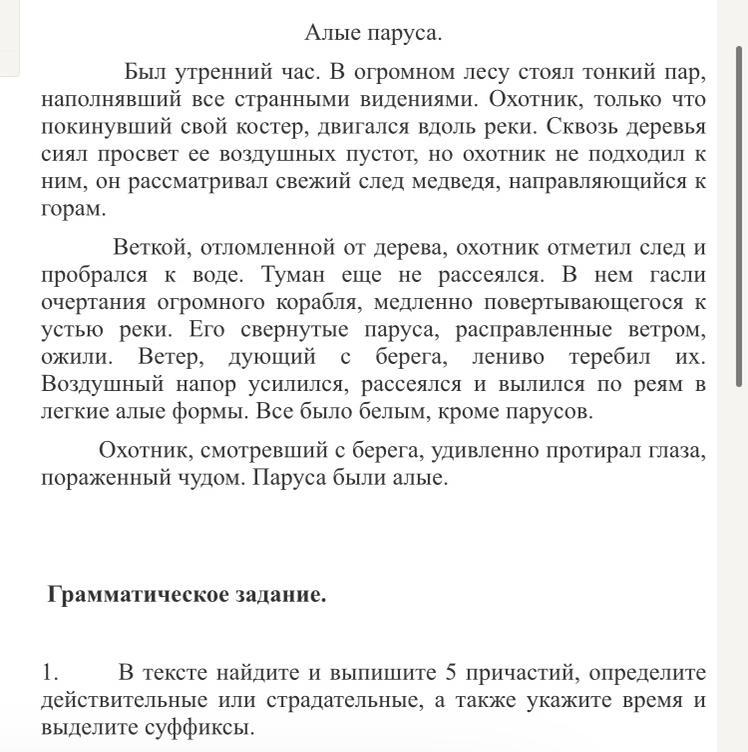 Причастные обороты: "наполнявший всё странными видениями", "покинувший свой костёр", "напрявляющийся к горам", "отломленной от дерева", "медленно повёртывающегося к устью реки", "расправленные ветром", "дующий с берега", "смотревший с берега".