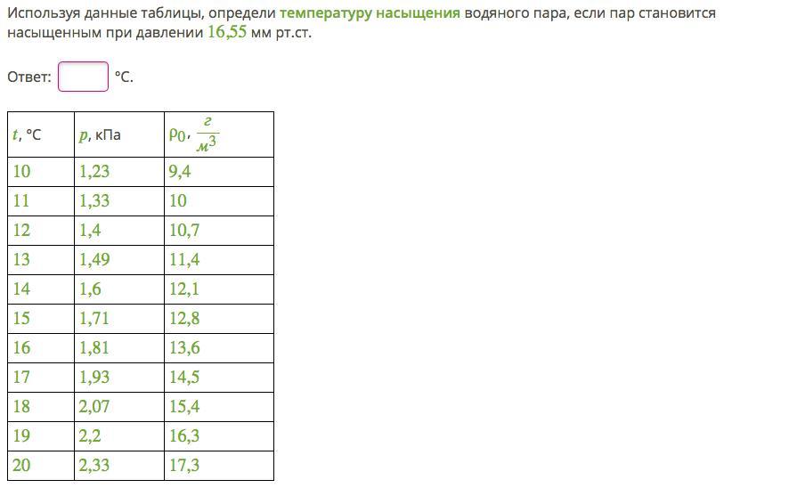Используя данные таблицы, определи температуру насыщения водяного пара, если пар становится насыщенным при давлении 16,55 мм рт.ст.