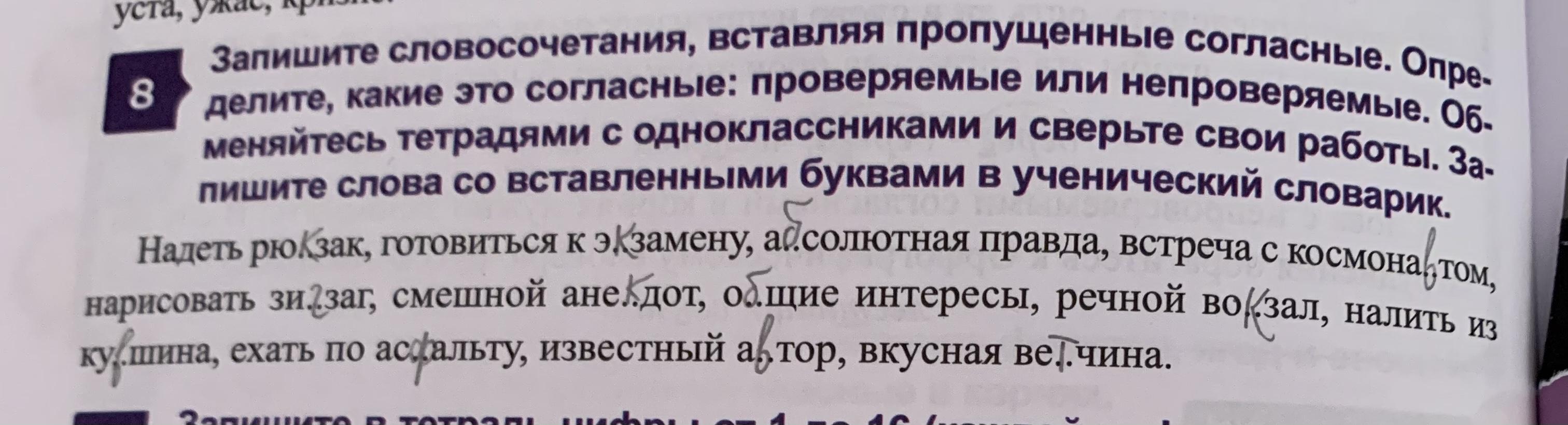 8. запишите словосочетания, вставляя пропущенные согласные . определите , какие это согласные: проверяемые или непроверяемые . обменяйтесь тетрадями с одноклассниками и сверьте свои работы. заменяйтесь тетрадями с одноклассниками и сверьте свои работы . запишите слова со вставленными буквами в ученический словарик .