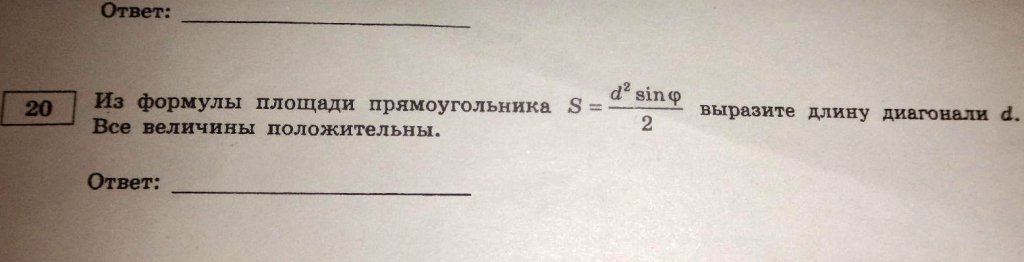 весь пример умножаем на 2, чтобы избавиться от знаменателей. получаем 2S=d^2*sinф, отсюда d^2=2S/sinф, ну а d= корень из 2S/sinф