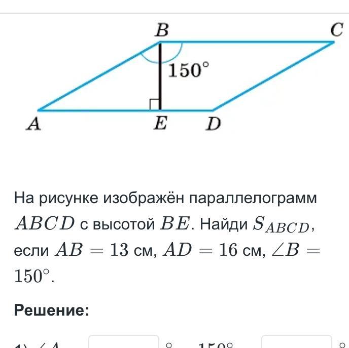sinA=BE/AB, sin30°=BE/13, BE=1/2*13, BE=6.5. S=BE*AD=6.5*16=104 см²