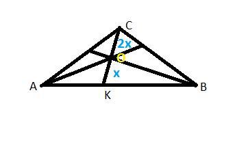 За теоремою про точку перетину медіан, медіани точкою перетину діляться у відношенні 2 : 1 рахуючт від вершини кута, отже введемо коефіціент пропорційності х, тоді CO = 2х, OK = x.