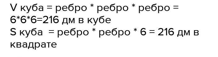 Vкуба=ребро*ребро*ребро=6*6*6=216дм в кубе