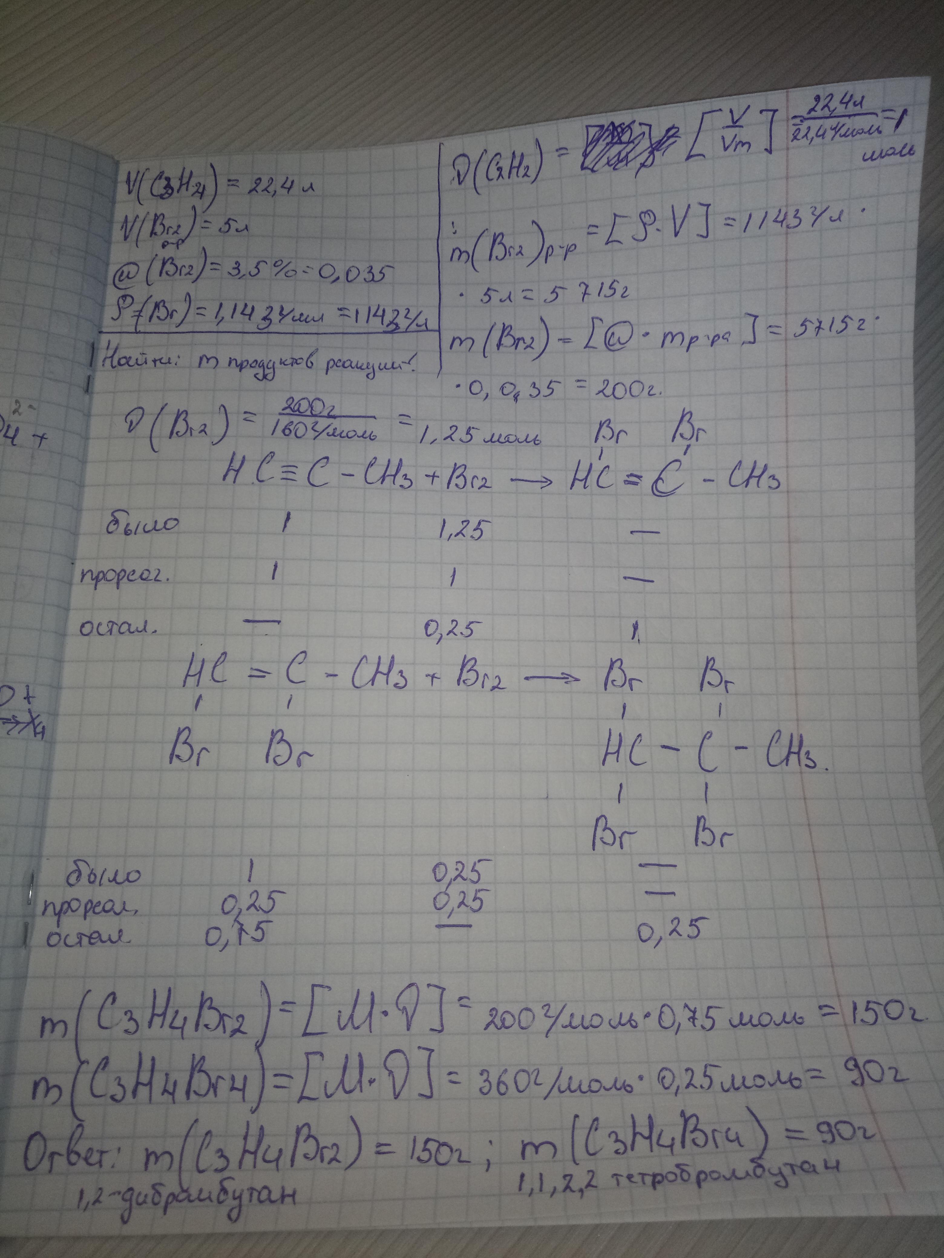 Пропин объемом 22,4 л пропустили через бромную воду объемом 5 л с массовой долей 3,5, плотностью 1,143 г/мл, определить массы продуктов реакции.