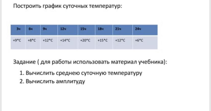 Начерти график y-x по Y ставь точки снизу вверх через одну-две клетки показатели температуры, а по линии X время, т.е 3,6,9 и т.д часов, и к каждому показателю ставь точку типо, понятно?