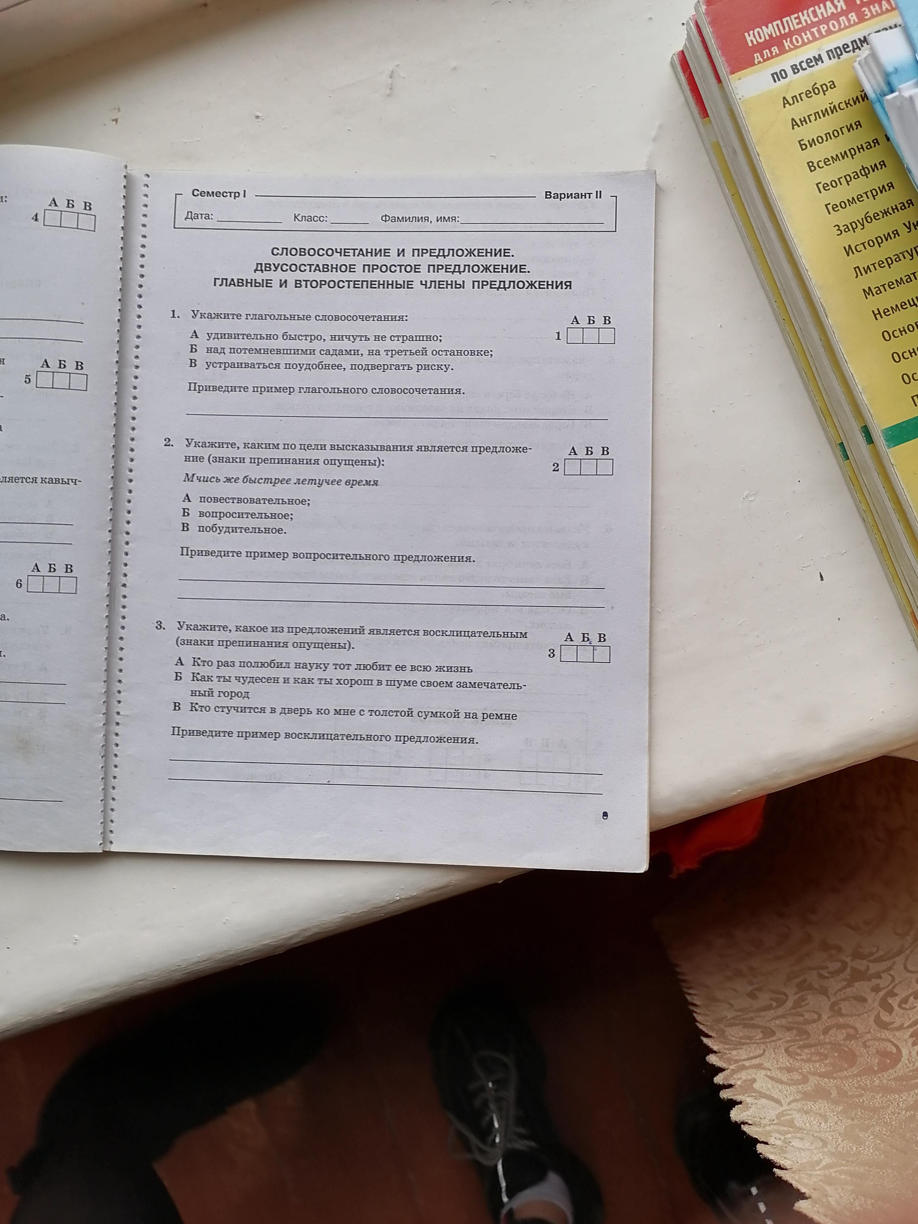 Ответ:1В пример- слушать внимательно ;2В пример- Когда ты вернулся со школы? ;3Б пример- С Новым годом! ;4В пример- В саду цветёт черёмуха; 5Б пример- мой дядя работает техником- испытателем; 6Б пример- Лес, словно живой, шевелился и дышал.