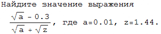 Подставляете значения под корни. Корень из 0.01 равен 0.1, корень из 1.44 равен 1.2. Затем вычисляете числитель и знаменатель.