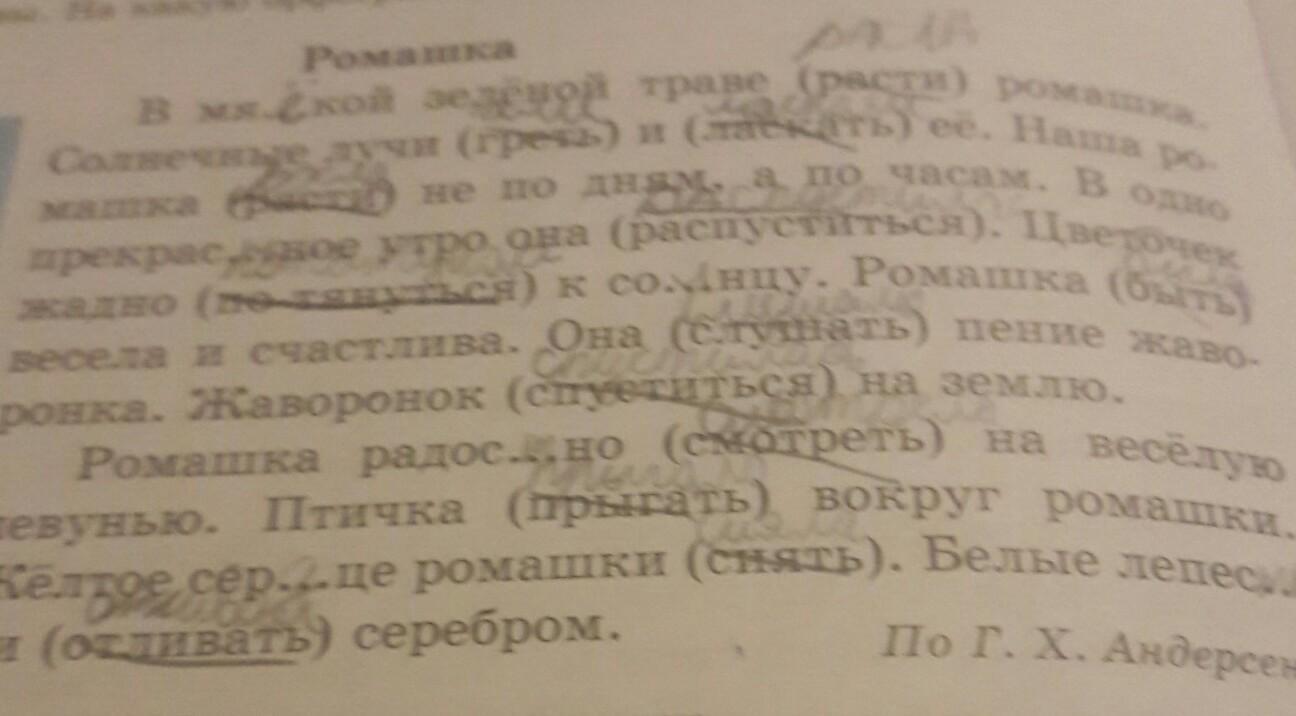 В мягкой зелёной траве росла(расти) ромашка.Солнечные лучи грели(греть) и ласкали(ласкать) её.Наша ромашка росла(расти) не по дням, а по часам.В одно прекрасное утро она распустилась(распуститься).Цветочек жадно по тянулся(тянуться) к солнцу.Ромашка была(быть) весела и счастлива.Она слушала(слушать) пение жаворонка.Жаворонок спустился(спуститься) на землю.
