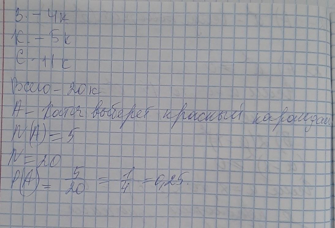 У Кати есть 4 зелёных, 5 красных и 11 синих карандаша. Какова вероятность, что случайно выбранный Катей карандаш будет красным?