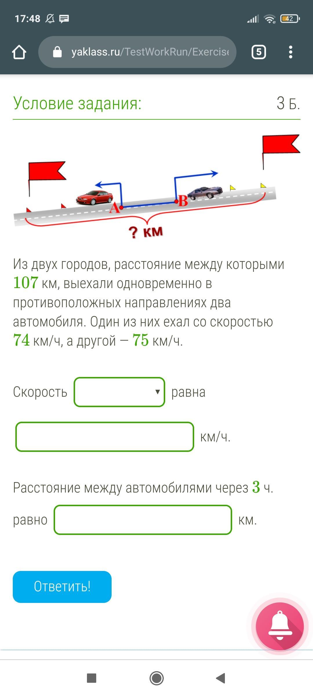 Из двух городов, расстояние между которыми 107 км, выехали одновременно в противоположных направлениях два автомобиля. Один из них ехал со скоростью 74 км/ч, а другой — 75 км/ч.