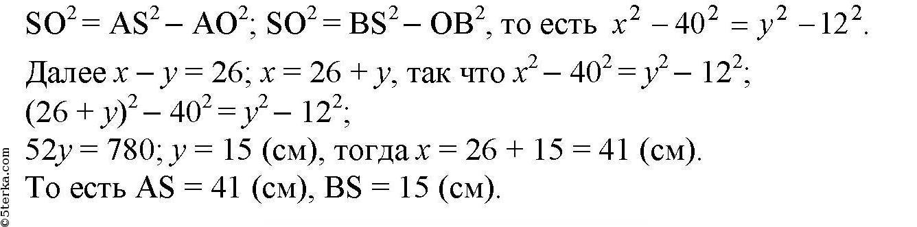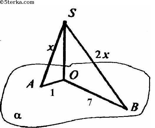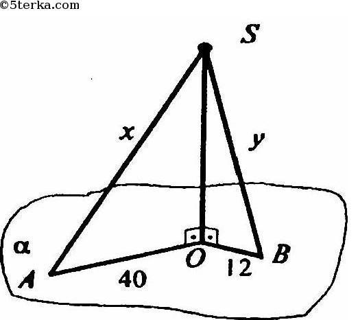 1) Проведем SO - перпендикуляр к плоскости α, и обозначим SA = x, SB = y; x > y, так как AO > OB. Из двух прямоугольных тре- угольников SOA и SOB получаем: